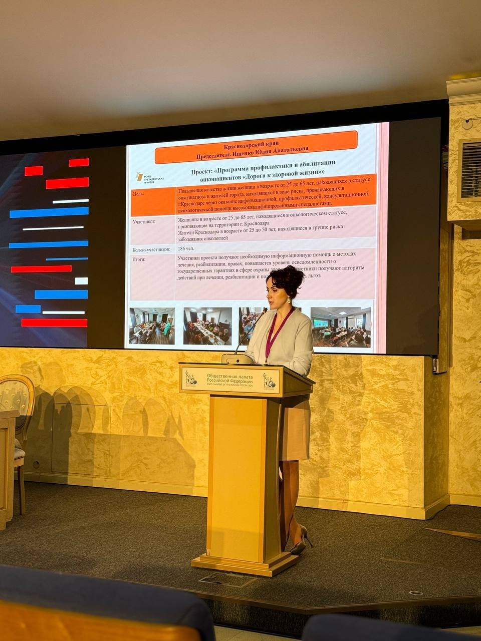 25 октября 2024 года директор АНО "Моя Жизнь" Ю.А. Ищенко - председатель Краснодарского отделения ВООПП "Ассоциация онкологических пациентов" Здравствуй! ", выступила с отчетной презентацией о деятельности организации на площадке Общественной палаты Российской Федерации.