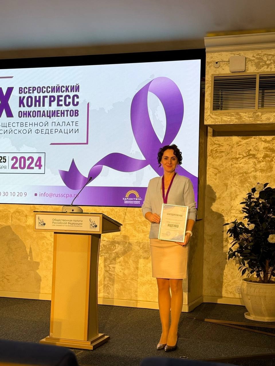 По окончании доклада Юлии Анатольевне было вручено благодарственное письмо за активную работу и помощь онкологическим пациентам и их семьям по всей стране.