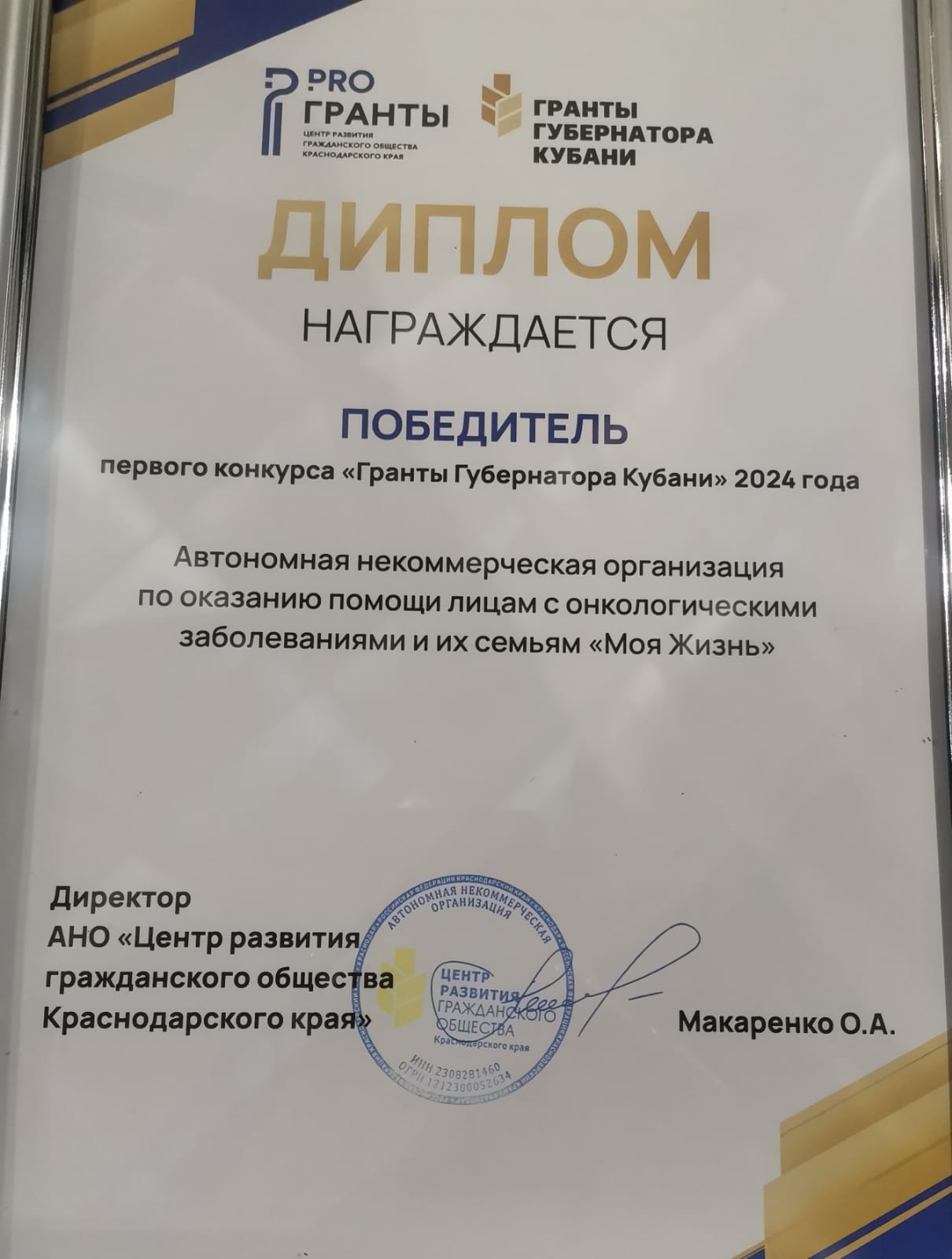 Рады сообщить, что наша Автономная некоммерческая организация по оказанию помощи лицам с онкологическими заболеваниями и их семьям "Моя Жизнь" стала победителем конкурса Грантов Губернатора Краснодарского края.